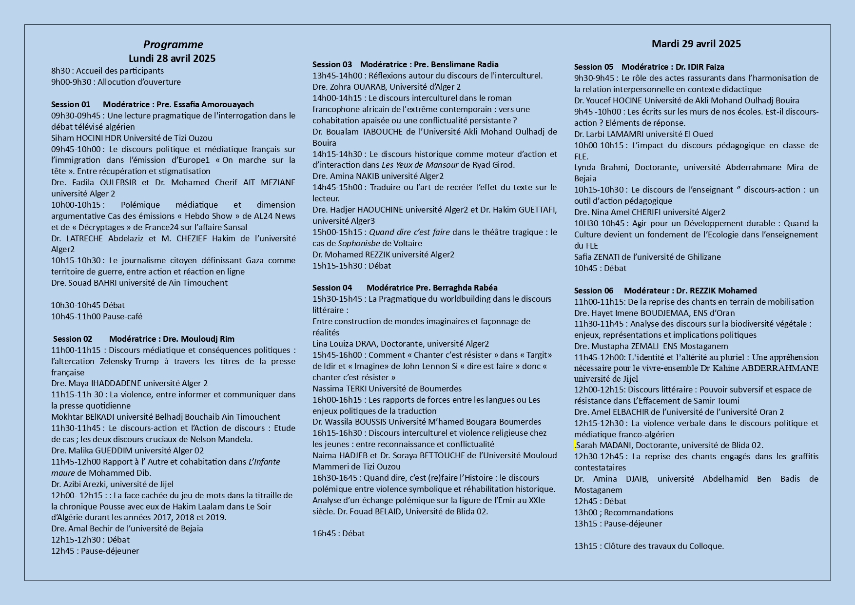 Programme du Colloque Discours-action Catégorie : Archive évènements Création : mardi 29 avril 2025 17:18 Écrit par Super User Imprimer E-mail Twitter