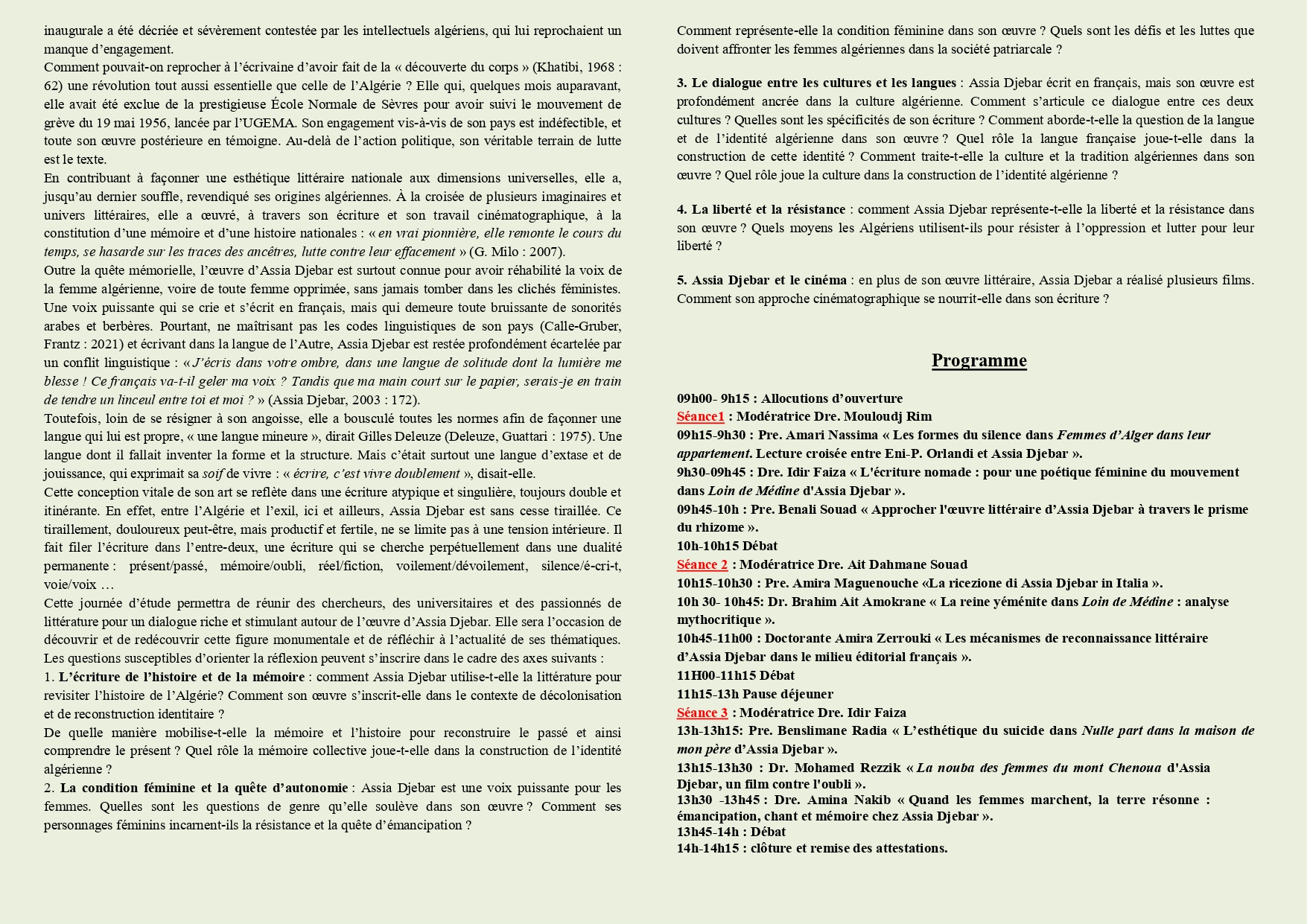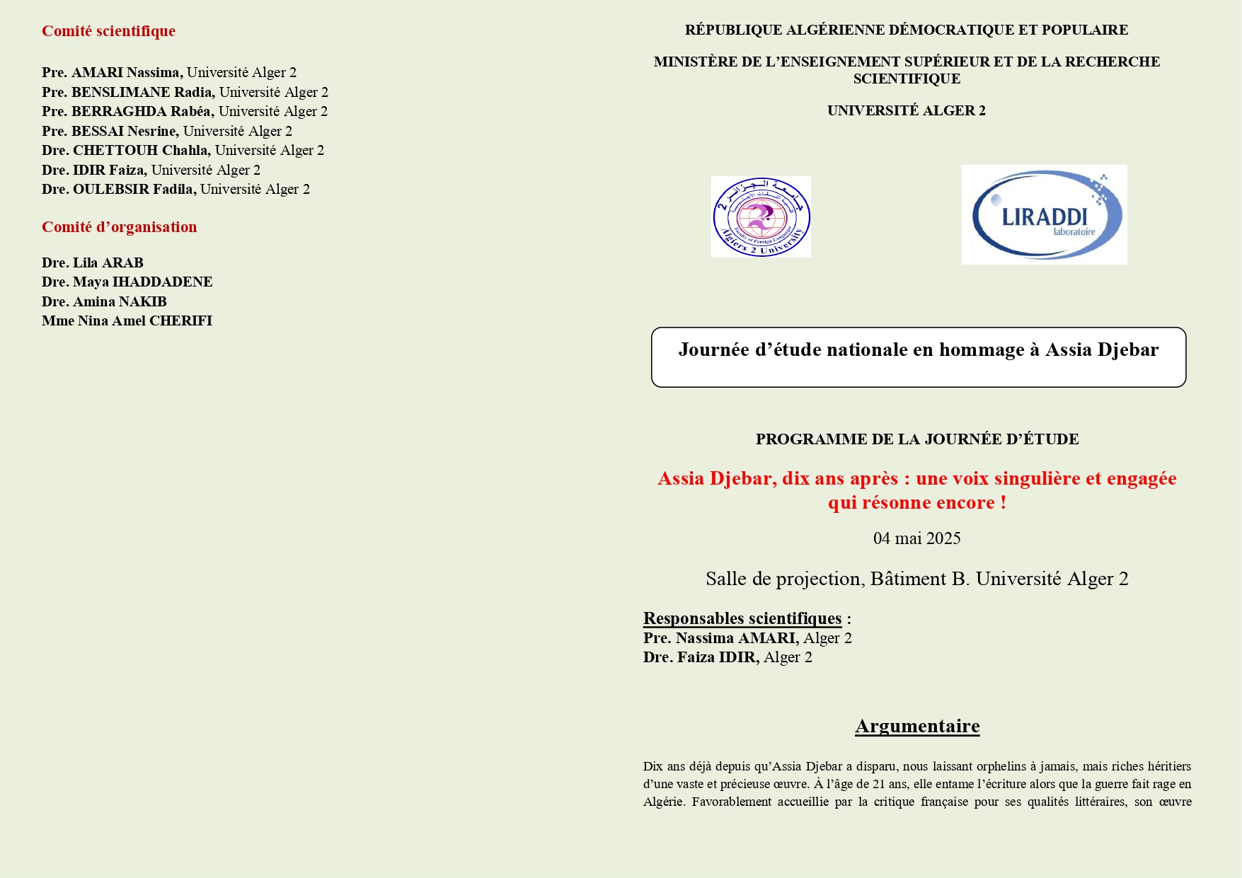 PROGRAMME DE LA JOURNÉE D’ÉTUDE Assia Djebar, dix ans après : une voix singulière, engagée et qui résonne encore ! 04 mai 2025 Catégorie : Archive évènements Création : samedi 3 mai 2025 07:55 Écrit par Super User Imprimer E-mail Twitter